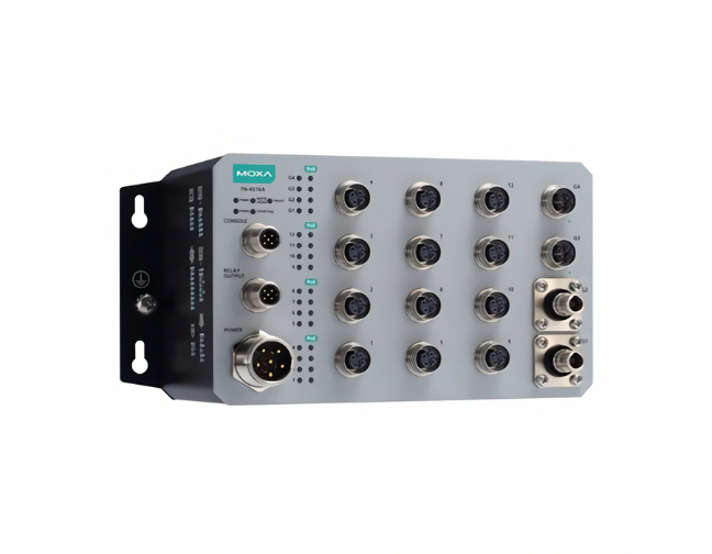 TN-4516A-12PoE-2GPoE-2GODC-WV-T, is ToughNet TN-4500A Series M12 managed Ethernet switches are designed for railway applications, including rolling stock and wayside installations. The switches use M12 and other circular connectors to ensure tight, robust connections, and guarantee reliable operation in industrial environments where vibration and shock are commonplace. The TN-4500A Series Ethernet switches provide 12 or 24 fast Ethernet M12 ports with or without IEEE 802.3at/af compliant PoE functionality, and the Gigabit models have 4 Gigabit Ethernet interfaces with PoE and optional bypass relay functionality. In addition, the fiber models provide 2 Gigabit fiber interface ports with an embedded 2 km multimode fiber transceiver. The PoE switches are classified as power source equipment (PSE).