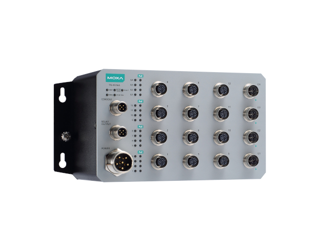 TN-4516A-12PoE-2GPoE-2GTXBP-WV-CT-T, is ToughNet TN-4500A Series M12 managed Ethernet switches are designed for railway applications, including rolling stock and wayside installations. The switches use M12 and other circular connectors to ensure tight, robust connections, and guarantee reliable operation in industrial environments where vibration and shock are commonplace. The TN-4500A Series Ethernet switches provide 12 or 24 fast Ethernet M12 ports with or without IEEE 802.3at/af compliant PoE functionality, and the Gigabit models have 4 Gigabit Ethernet interfaces with PoE and optional bypass relay functionality. In addition, the fiber models provide 2 Gigabit fiber interface ports with an embedded 2 km multimode fiber transceiver. The PoE switches are classified as power source equipment (PSE).