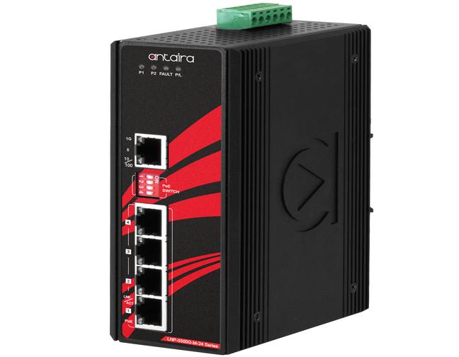 Antaira Technologies' LNP-0500G-bt-24-T is an industrial gigabit PoE++ unmanaged Ethernet switch featuring 4*10/100/1000Tx Gigabit Ethernet ports that support IEEE802.3bt for a maximum of 90W/port and 1*10/100/1000Tx Ethernet port. The LNP-0500G-bt-24-T is an ideal solution for rapid, unmanaged gigabit network expansion with PoE++ capabilitiesThe LNP-0500G-bt-24-T is IP30 rated and DIN-rail mountable. There are also an extended temperature range: -40C to 75C. It also provides Ethernet connectivity with PoE functions for outdoor or harsh industrial automation application environments, such as security surveillance, ITS-traffic monitoring systems, oil/gas and mining, facility management for power/utility, water wastewater treatment plants, and lastly, automated production lines in factory automation.