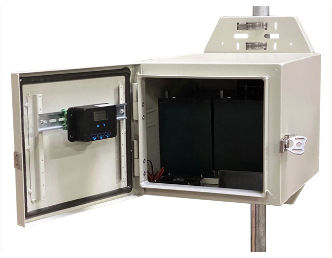 Features include 24VDC load controlled output, an advanced 20A PWM battery charge controller to protect against overcharging or over-discharging of the valve regulated sealed lead acid AGM batteries. The pole/wall mount aluminum enclosure has multiple ports for CAT5 cable, antenna cables/connectors or other cabling. They have thermostatically controlled power ventilation which turns on automatically when inside temperature exceeds 45C.